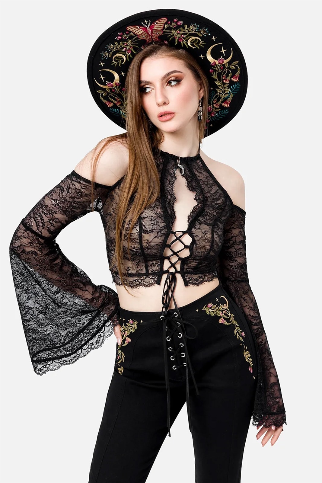Diese Schlaghose verbindet Vintage-Flair mit mystischem Charme. Gefertigt aus weichem, elastischem Denim, zeigt sie eine aufwendige Stickerei aus Motten und floralen Elementen an Hüfte und Rückenpasse – inspiriert von der Magie wilder Gärten. Die hohe Taille mit Schnürdetail vorn und figurbetonte Nähte formen eine schmeichelhafte Silhouette, während die ausgestellten Beine einen Hauch 70s-Romantik verleihen. Perfekt für Hexen, Tagträumerinnen und alle, die sich zwischen Wald und Mond zuhause fühlen.