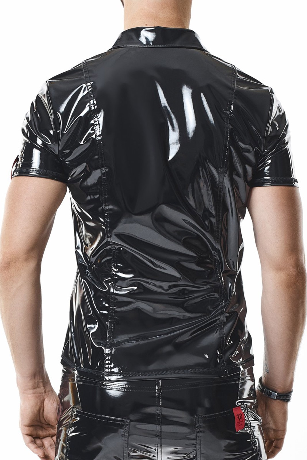 Poloshirt aus schwarzem, glänzendem PVC. Es verfügt über einen eleganten Kragen auf der Vorderseite und einen dunklen Reißverschluss, der individuellen Charakter verleiht, wobei das RFP Regnes Fetish Planet-Logo auf dem Reißverschluss eingraviert ist. Auf der Rückseite befinden sich zwei vertikale Nähte, die die Taille optisch verschlanken und die Schulter- und Brustlinie verbreitern, wodurch eine muskulösere Silhouette entsteht.