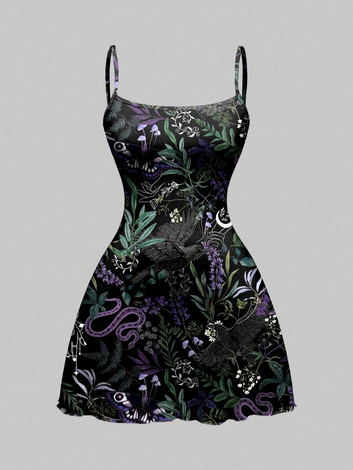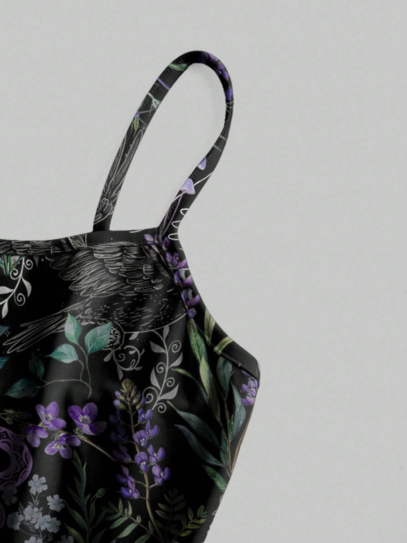 Das Serpent Garden Kleid vereint düstere Romantik mit geheimnisvoller Symbolik. Das detailreiche Muster zeigt Schlangen, Raben, Schmetterlinge und florale Elemente in tiefen Grüntönen, Violett und Schwarz – wie ein nächtlicher Hexengarten voller Leben. Die feinen Spaghettiträger und der feminine Schnitt betonen die Silhouette und verleihen dem Kleid eine leichte, fließende Eleganz. Perfekt für magische Sommernächte und mondbeschienene Spaziergänge.