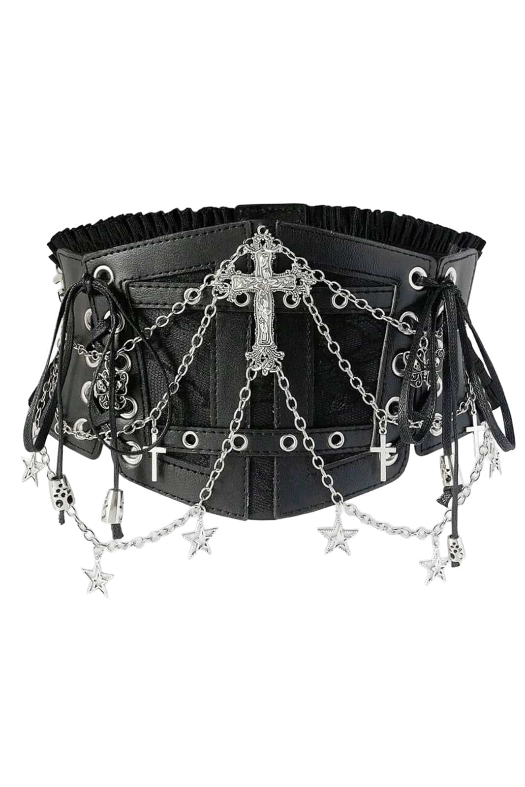 Miedergürtel aus einem hochwertigen Kunstleder Frontpanel mit elastischem Rückenband bestückt mit Druckknöpfen. Die Front ist zusätzlich mit einer seitlichen Schnürung versehen um das Mieder perfekt an dieTaille anpassen zu können. Verziert mit Kreuzen, Sternen und silbernen Ketten.