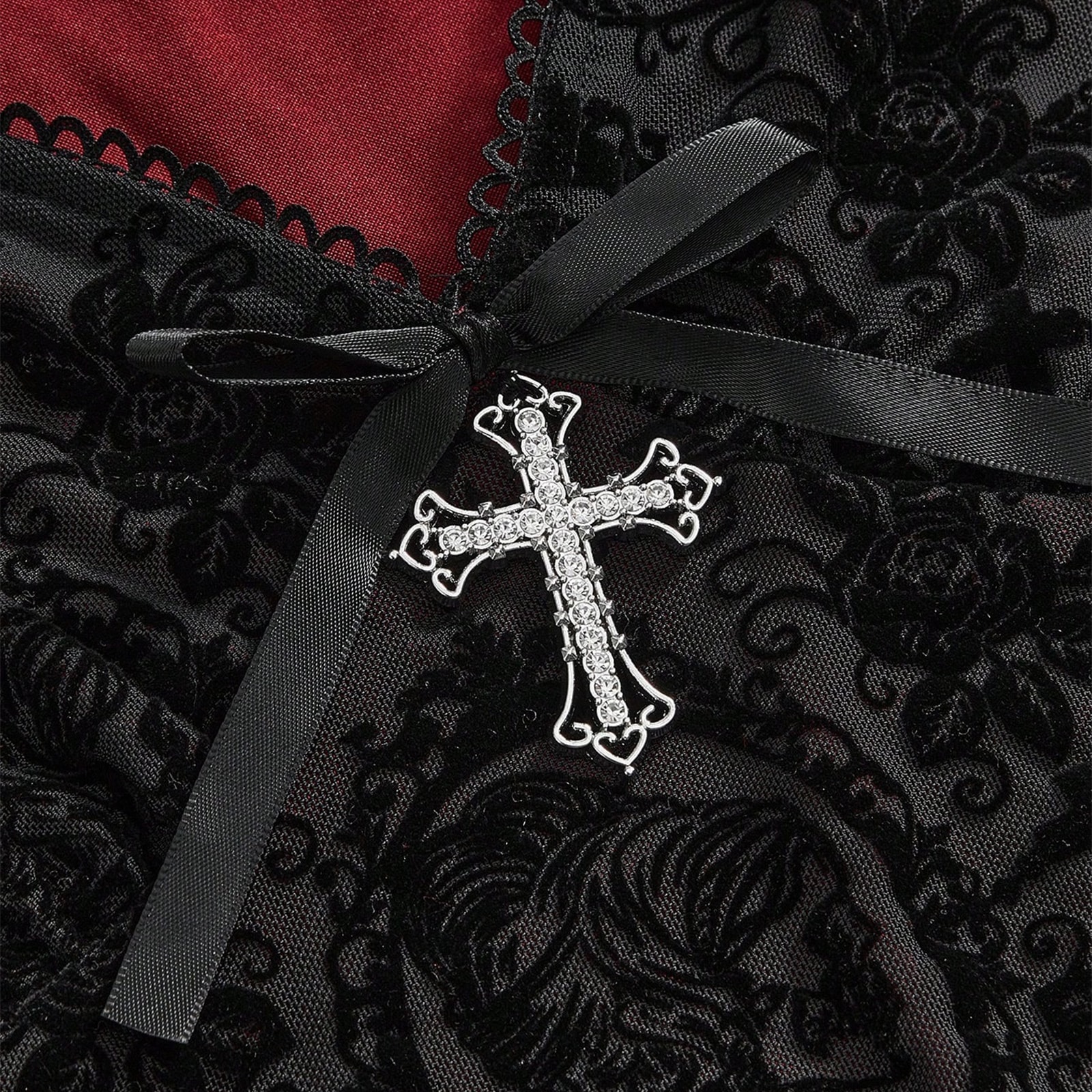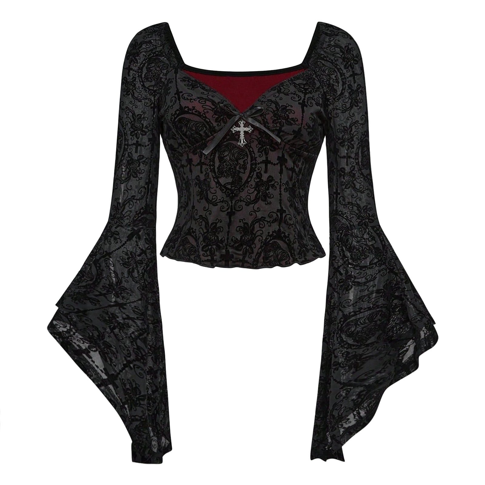 Dieses Gothic-Top vereint romantische Melancholie mit düsterem Kirchenturm-Flair. Schwarzer Samt-Flockprint auf transparentem Mesh umhüllt die Silhouette, während das tiefrote Futter wie verborgenes Herzblut hervorblitzt. Ein funkelndes Kreuzornament schmückt den Ausschnitt und unterstreicht die sakrale Ästhetik. Die dramatisch ausgestellten Glockenärmel sorgen für eine anmutige, fast geisterhafte Bewegung. Perfekt für Nächte zwischen Kerzenschein und Kirchhofszauber.