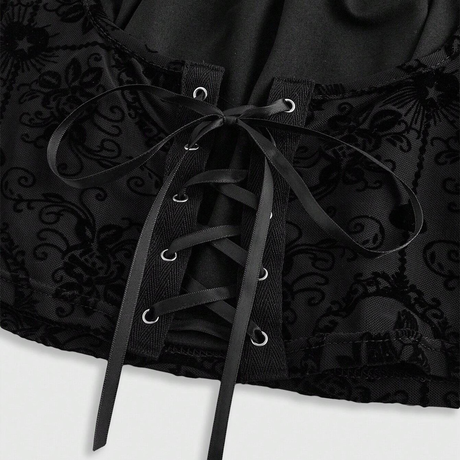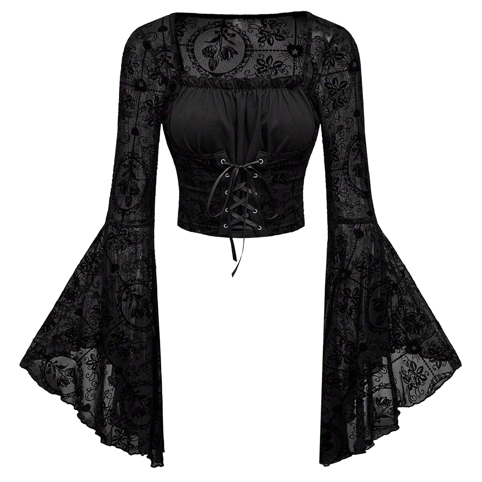 Das Enchanted Valeria Top vereint mystische Romantik mit dramatischer Eleganz. Der schwarze Stoff mit samtigem Ornamentmuster betont deine Silhouette, während die Schnürung vorne einen Hauch mittelalterlicher Magie verleiht. Besonders auffällig sind die weit ausgestellten Trompetenärmel aus transparenter Spitze – fließend, geheimnisvoll und perfekt für Hexen, Elfen und Gothic-Musen. Ideal für Festivals, Fotoshootings oder stilvolle Alltagsmomente mit Fantasy-Flair.