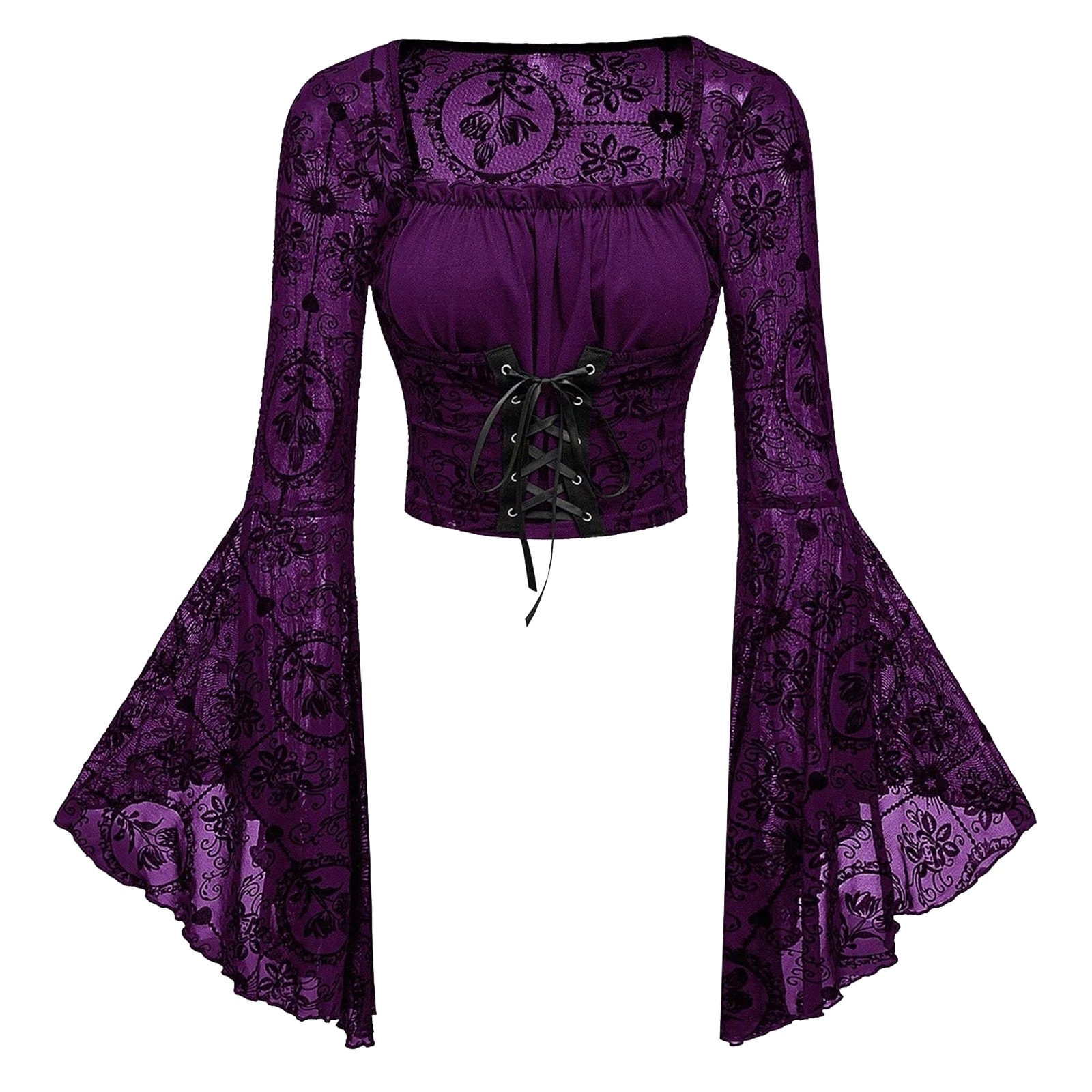 Das Enchanted Valeria Top vereint mystische Romantik mit dramatischer Eleganz. Der tiefviolette Stoff mit samtigem Ornamentmuster betont deine Silhouette, während die Schnürung vorne einen Hauch mittelalterlicher Magie verleiht. Besonders auffällig sind die weit ausgestellten Trompetenärmel aus transparenter Spitze – fließend, geheimnisvoll und perfekt für Hexen, Elfen und Gothic-Musen. Ideal für Festivals, Fotoshootings oder stilvolle Alltagsmomente mit Fantasy-Flair.