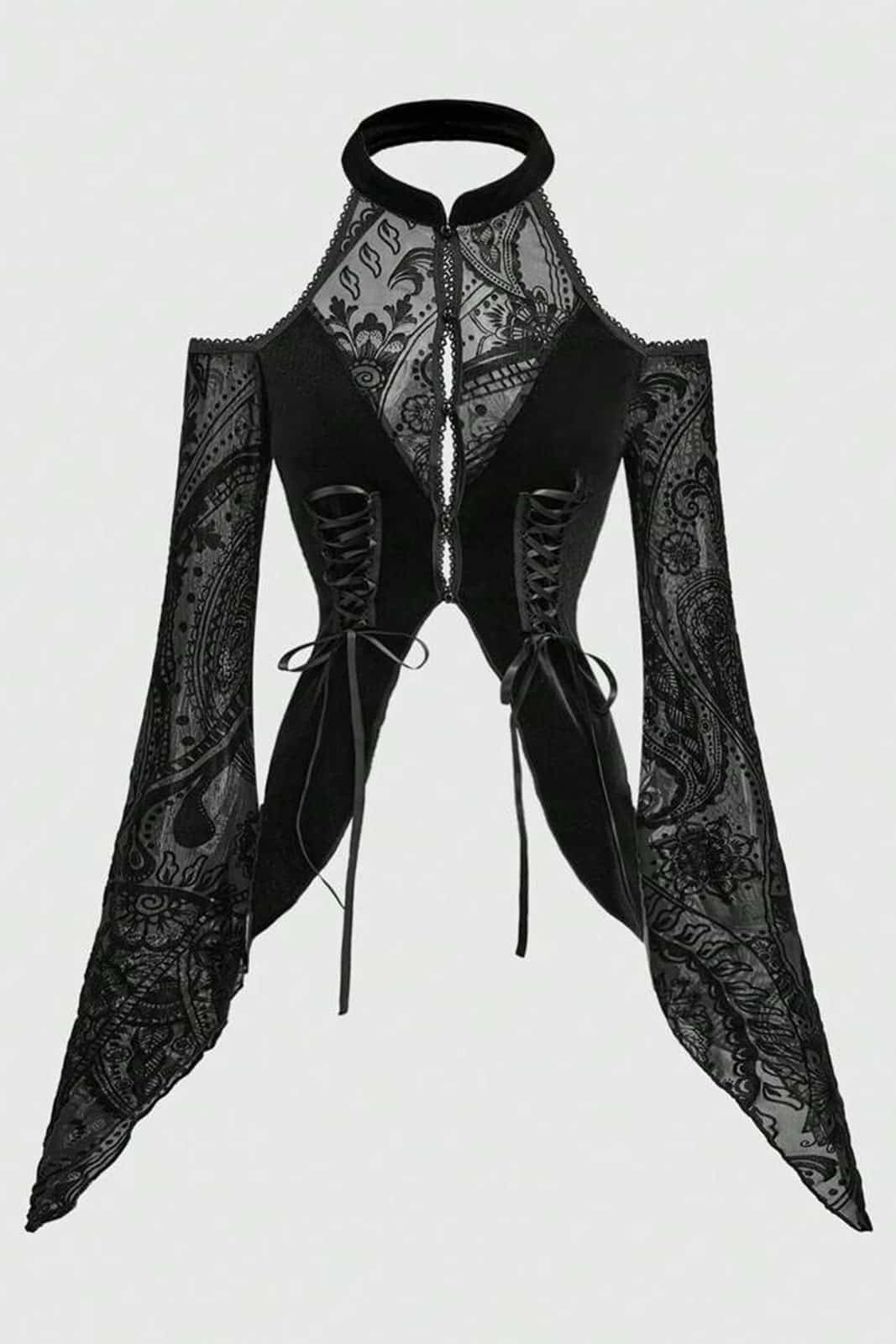 Schulterfreies Samttop mit transparenten Einsätzen und langen Ärmeln. Das feine Netzmaterial ist mit wunderschönen Grafiken beflockt. Vorn geknöpft. Die langen Trompetenärmel sind komplett transparent und beflockt. Mit kleinem Stehkragen aus weichem Samt.