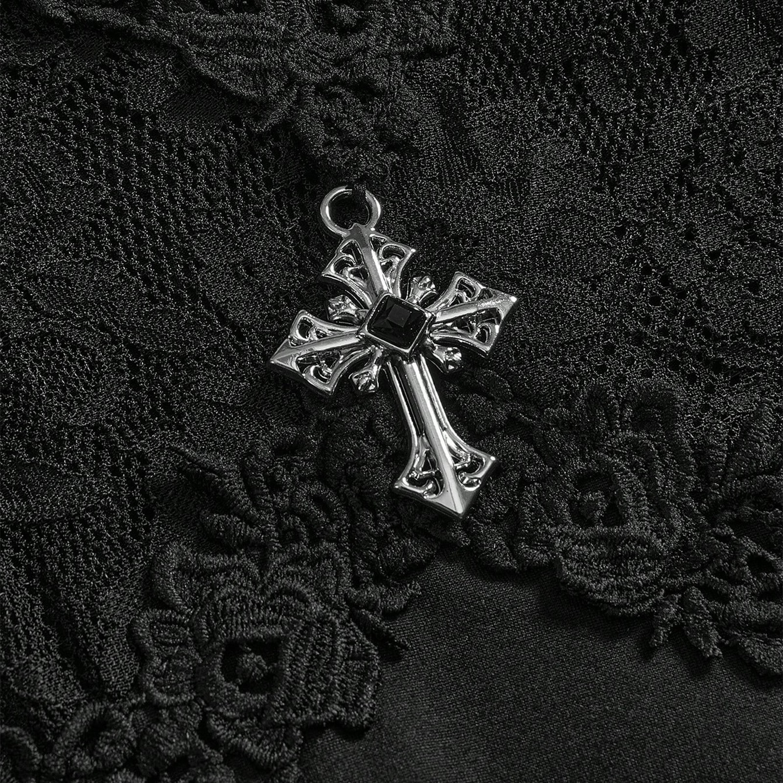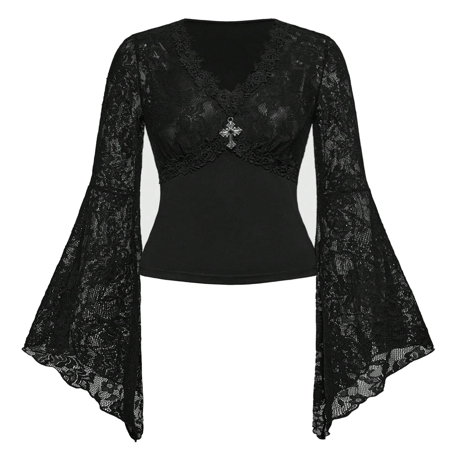 Dieses Spitzen-Top vereint sakrale Eleganz mit dunkler Romantik. Der figurbetonte Schnitt formt eine schöne Silhouette, während der transparente Spitzeneinsatz mit V-Ausschnitt und Kreuzdetail für mystische Akzente sorgt. Die weit ausgestellten Trompetenärmel aus feiner Spitze verleihen dem Design eine dramatische, fast zeremonielle Wirkung – perfekt für Gothic-Events, Fantasy-Looks oder besondere Abende mit Flair.