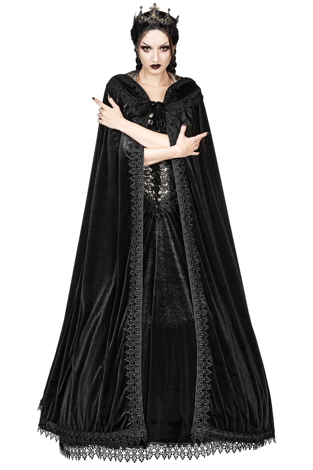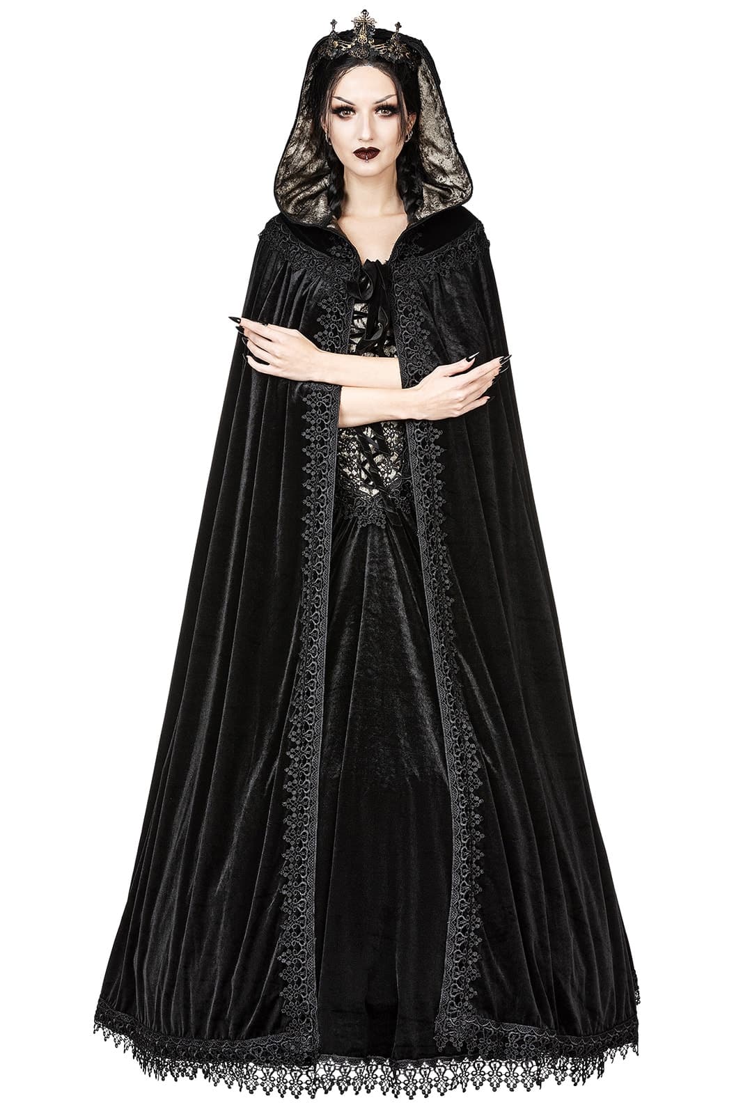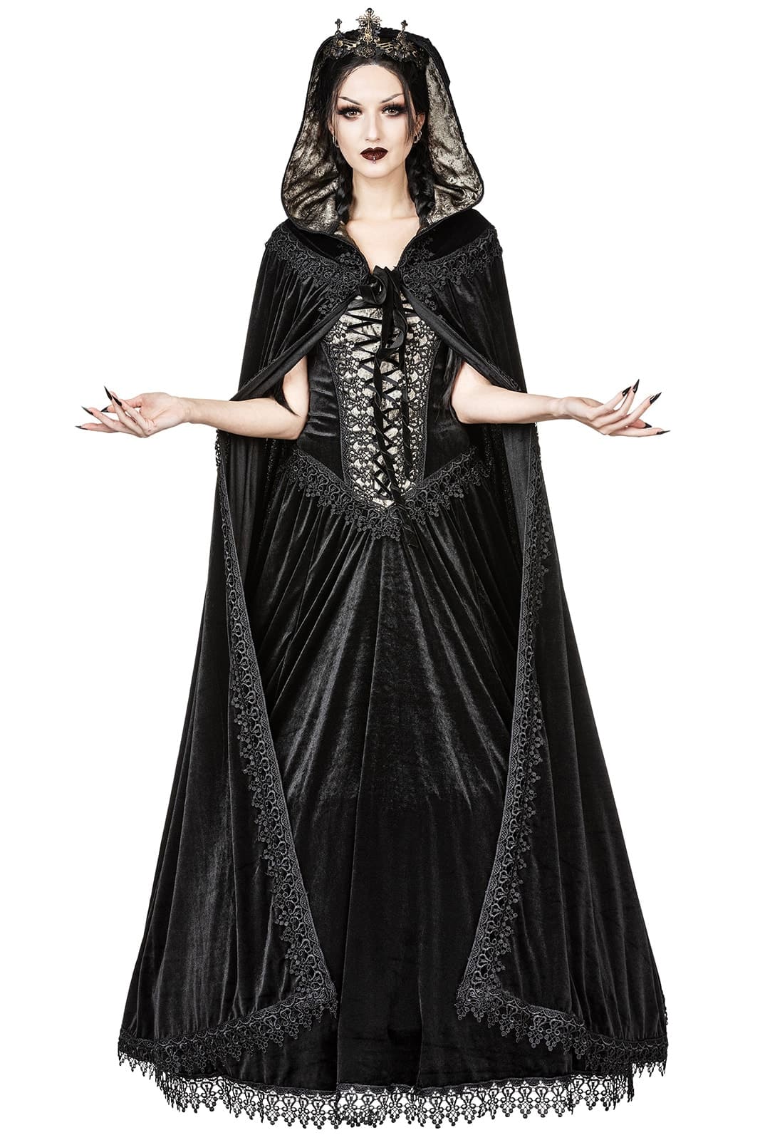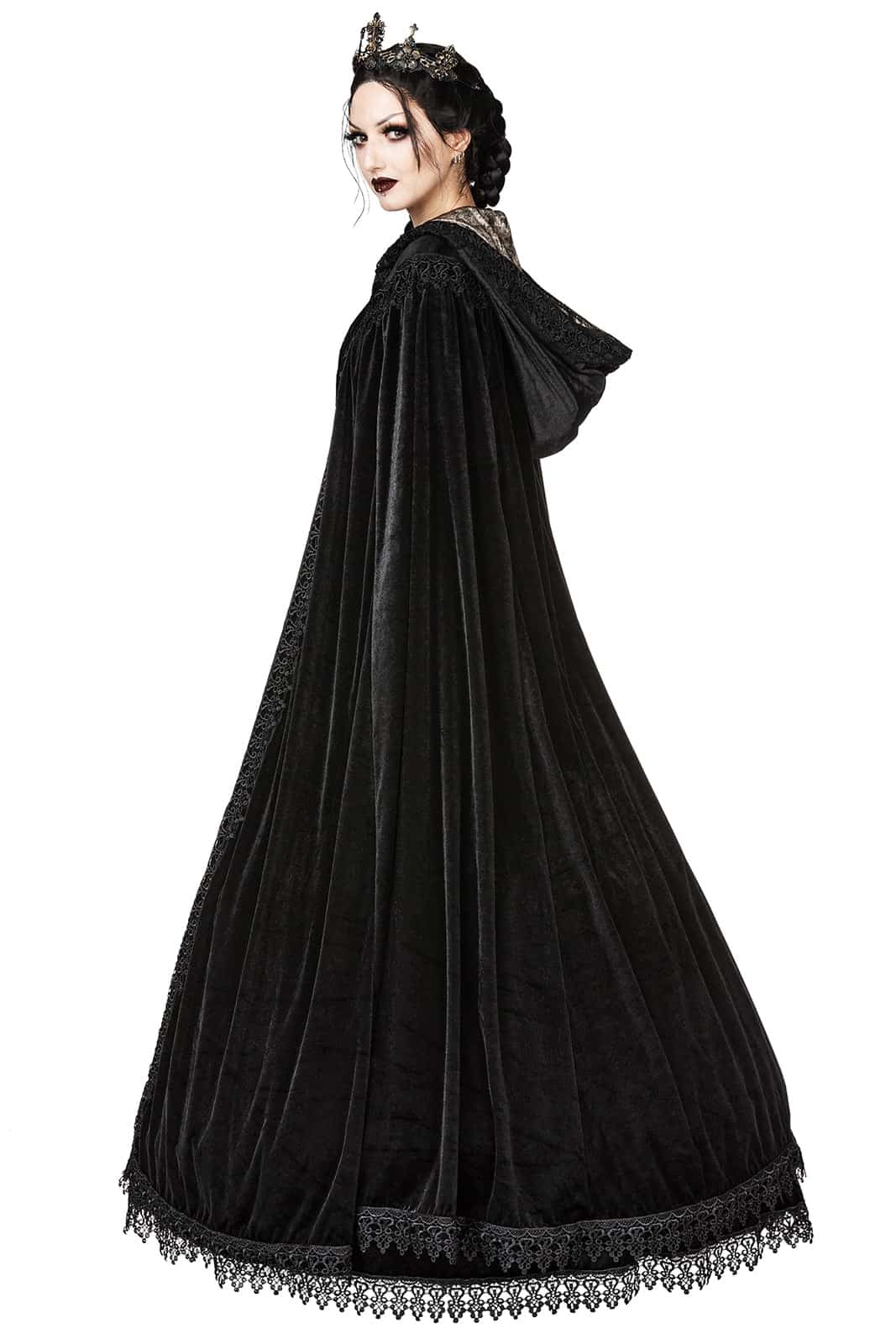 Dieser prächtige Umhang aus schwarzem Samt verleiht jedem Auftritt eine königliche Aura. Die weite Kapuze ist mit schimmerndem, bronzefarbenem Taft gefüttert und rundum mit aufwendiger Brokatspitze verziert. Eine Samtschleife schließt den Mantel elegant am Hals, während die reich verzierte Spitzenkante dem gesamten Design eine mittelalterlich-romantische Note verleiht – perfekt für mystische Abende, Bühnenauftritte oder festliche Gothic-Events.