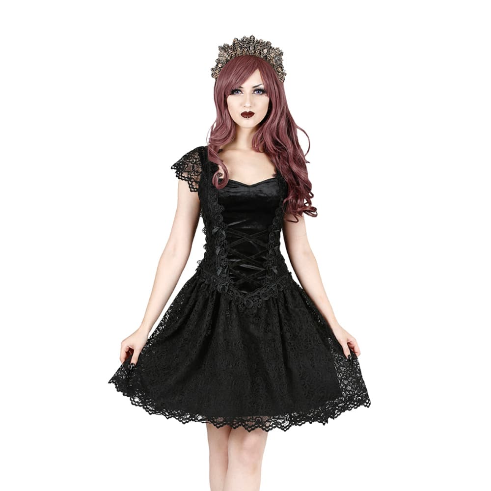 Kurzes Gothic Minikleid aus Samt, Spitze und Satin. Voluminöses Rockteil mit wunderschönem Spitzenoverlay, verziert mit kleinen Schleifen. Oberteil mit Flügelärmeln aus feiner Spitze.
