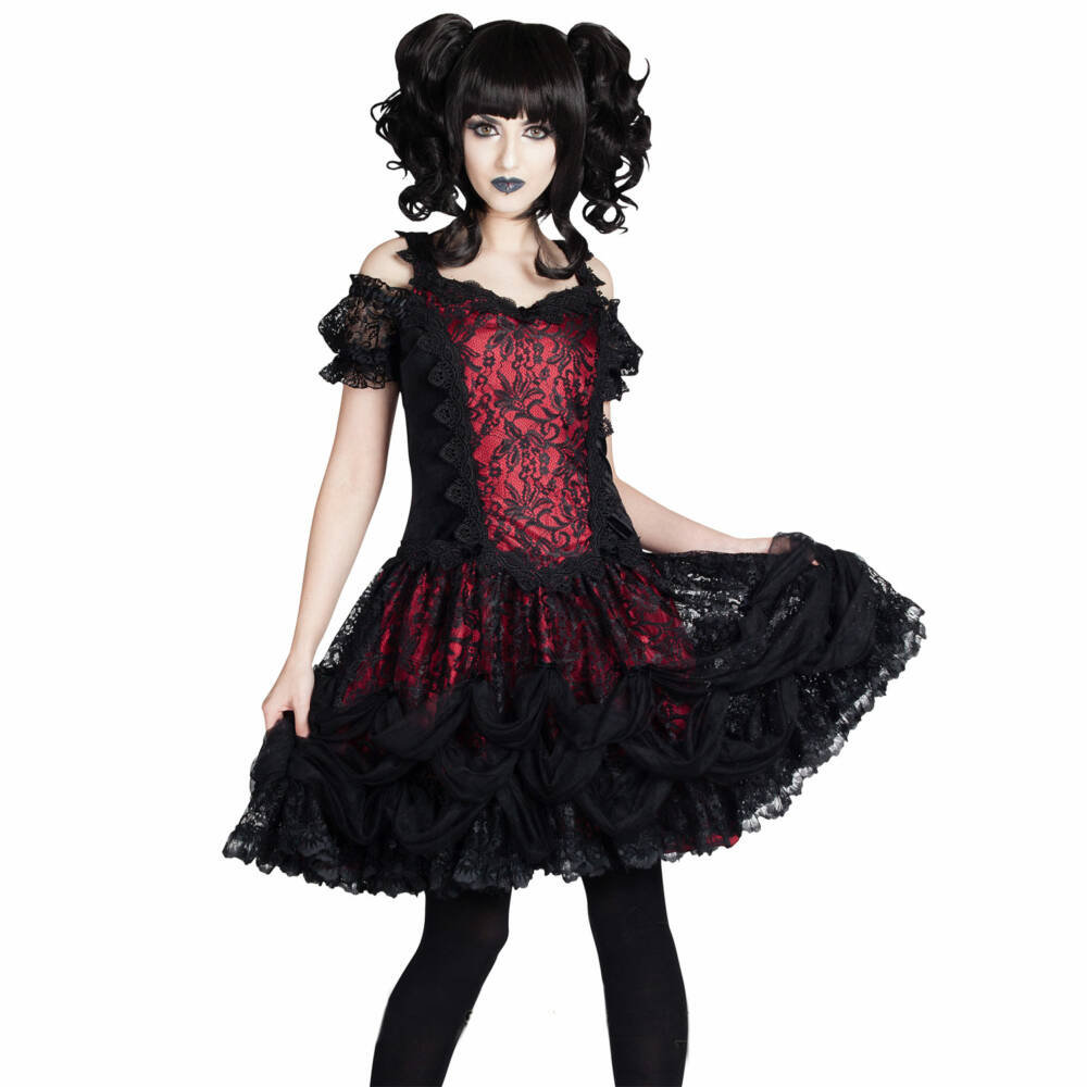 Kurzes Gothic Minikleid mit einem Rockteil aus Satin und Spitze mit gerafften Tüllbesatz, das Samtoberteil mit Spitzenoverlay ist verziert mit einer breiten Spitzenborte. Mit Puffärmeln aus Spitze, verziert mit kleinen Samtschleifen.