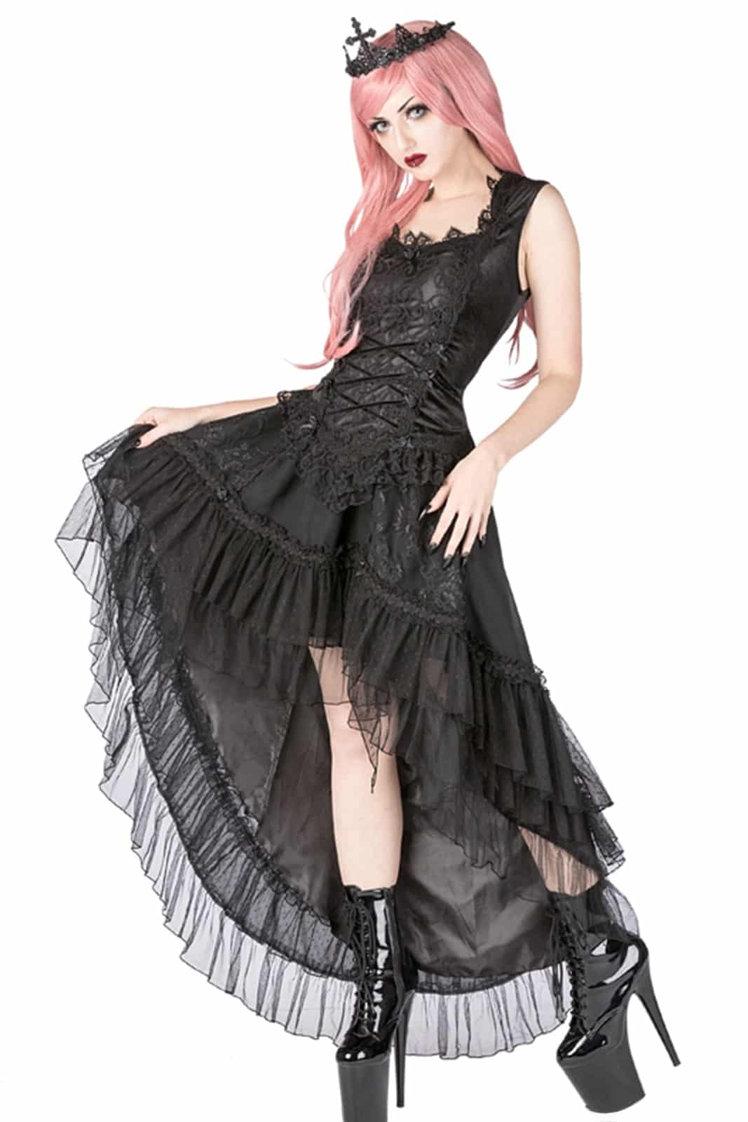 Langer Gothic-Vokuhila-Rock mit doppelter Rüsche aus weichem Mesh und Unterrock aus weichem, seidigem Satin. Die Seitenteile des schwarzen Chiffonrocks sind mit französischer Spitze überzogen und mit einem Band aus venezianischer Spitze besetzt. Elastischer Bund mit unsichtbarem seitlichem Reißverschluss für eine perfekte Passform.