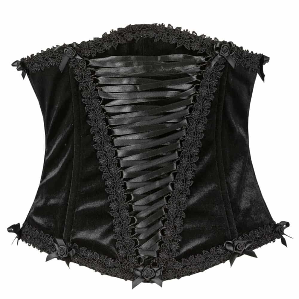 Leichtes Unterbrustkorsett aus Samt mit Kunststoff-Stäbchen und Frontschnürung. Verziert mit venezianischer Spitze und Satinrosenknopsen. Komplett mit seidig weichem Satinfutter gefüttert.