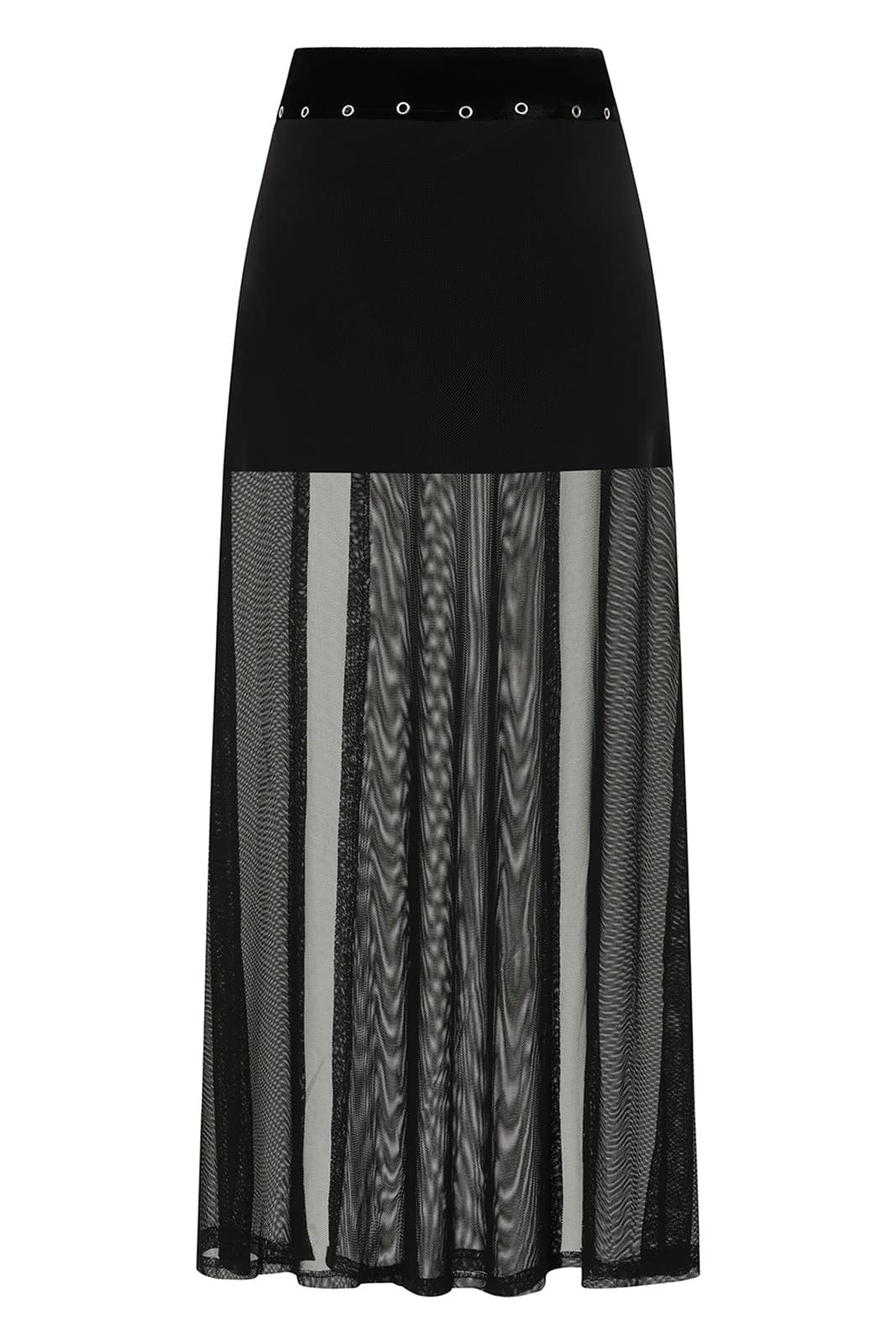 Dieser lange Rock von Banned verbindet luxuriösen Samt mit leichtem Mesh und sorgt so für eine dunkle, mystische Ausstrahlung. Der Samtbund mit silbernen Ösen und markantem Ringdetail setzt ein punkig-gothisches Statement, während der transparente Netzstoff sanft fällt und für einen dramatischen Kontrast sorgt. Ein ausdrucksstarkes Stück für alle, die ihren alternativen Style betonen möchten.