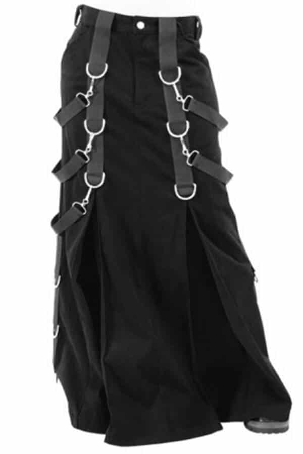 Der bodenlange Rock ist sowohl an der Front mit ca. 40 cm langen Bändern und auf der Rückseite komplett durchgehend mit leicht glänzenden Bändern bestückt mit D-Ringen versehen. An den D-Ringen sind abnehmbare Riemen befestigt, die links und rechts pendeln. Zwei breite unterfütterte Gehschlitze bieten genügend Komfort auch für große Schritte.