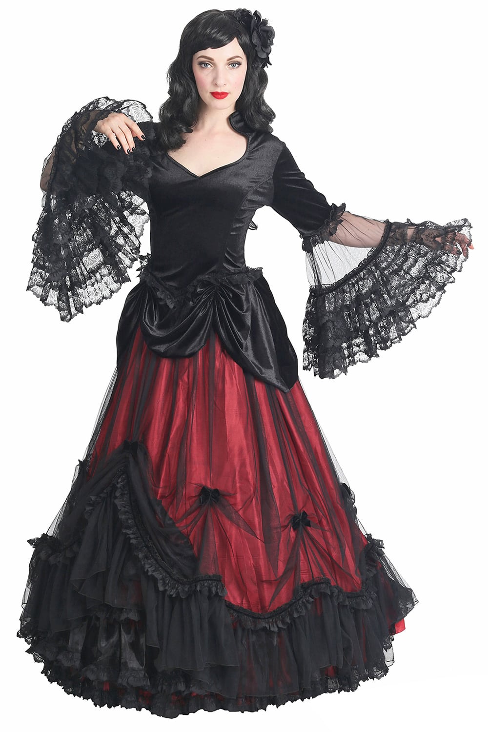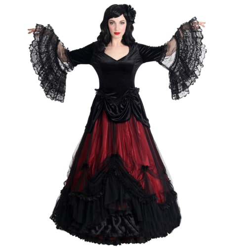 Langes, klassisches Gothic Kleid aus Samt und Satin, aufwändig verziert mit Blumen und Spitze. Das Oberteil aus weichem Samt ist mit einem feinem Spitzenoverlay und einer Zierschnürung ausgestattet.