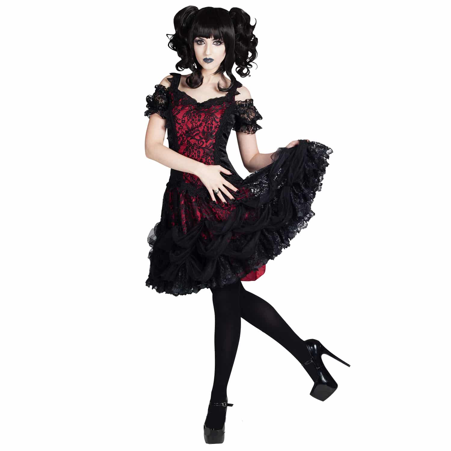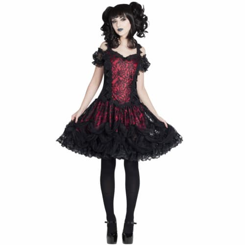 Mehrlagiger Romantic Goth Satinrock mit weichem, gerafften Netz-Overlay, verziert mit Satinschleifen. Traumhaft veredelt mit venezianischer Spitze. Weit schwingend geschnitten, mit bequemem Gummizugbund. Perfekt kombinierbar mit dem Gothic Rose Top 13381.Kurzes Gothic Minikleid mit einem Rockteil aus Satin und Spitze mit gerafften Tüllbesatz, das Samtoberteil mit Spitzenoverlay ist verziert mit einer breiten Spitzenborte. Mit Puffärmeln aus Spitze, verziert mit kleinen Samtschleifen.