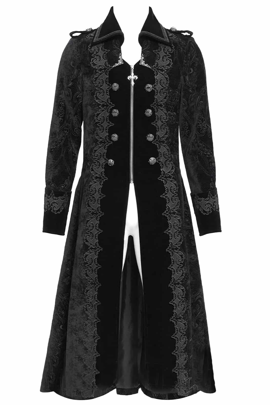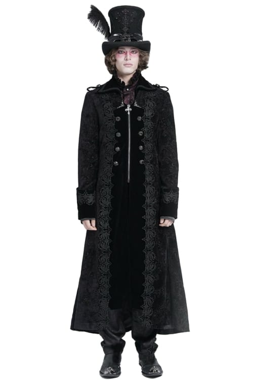 Edler, langer Gothic-Mantel für Herren aus tiefschwarzem Samt mit geprägtem Ornamentmuster und aufwendigen Stickapplikationen. Die Kombination aus Reißverschluss mit Kreuzanhänger, dekorativen Knöpfen und breiten Manschetten verleiht dem Look einen majestätischen, viktorianischen Charakter.
