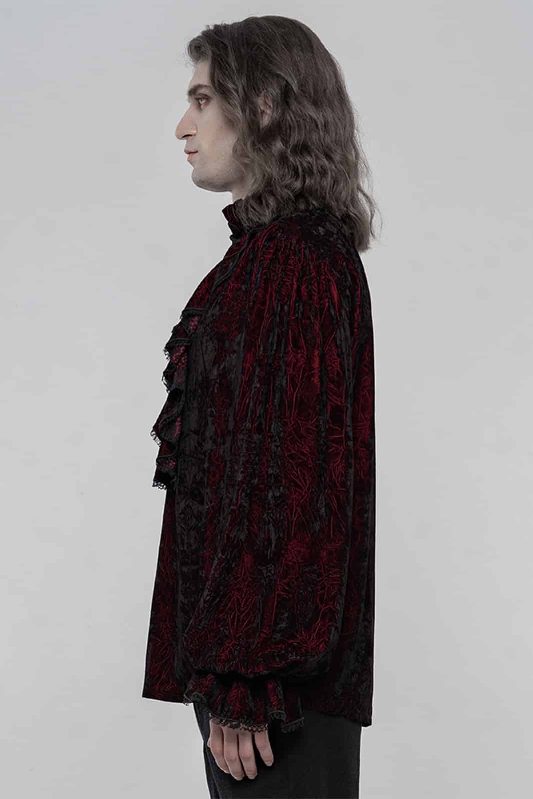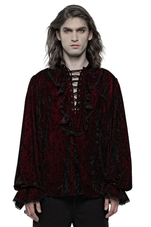 Klassisches Gothic-Herrenhemd aus tiefrotem, zerknittertem Samt mit romantischen Rüschen und Schnürung am Ausschnitt. Der fließende Schnitt und die poetischen Ärmel verleihen dem Design einen dramatisch-edlen Auftritt – perfekt für viktorianisch inspirierte Outfits.