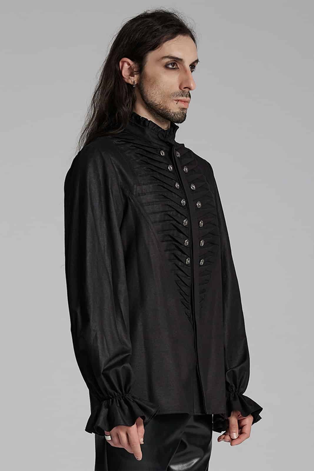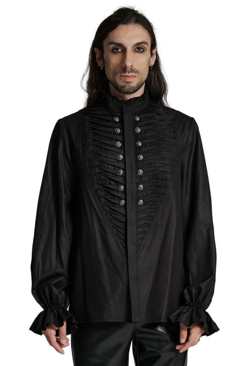 Elegantes Gothic-Herrenhemd aus schwarzem Polyester mit edler, strukturierter Frontpartie und Zierknöpfen im viktorianischen Stil. Der hohe Stehkragen und die gerafften Ärmelabschlüsse verleihen dem Hemd einen majestätischen, fast uniformartigen Charakter – perfekt für formelle Gothic-Events oder historische Outfits.