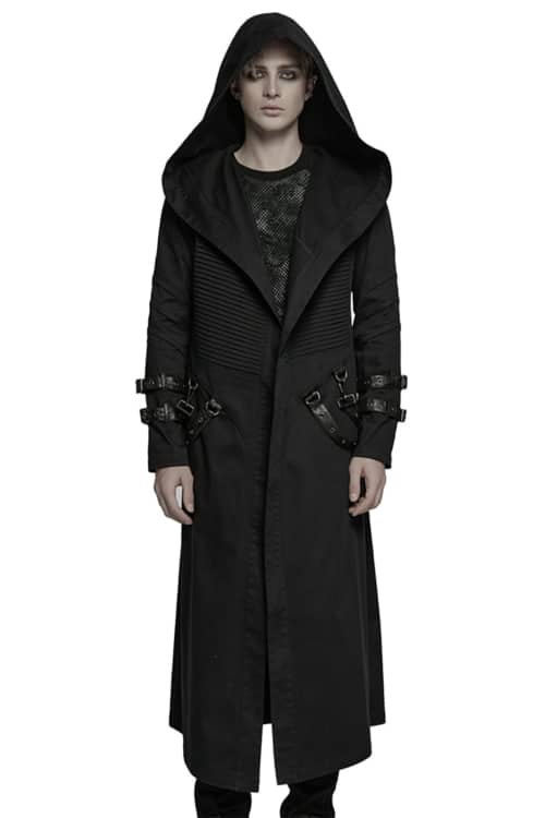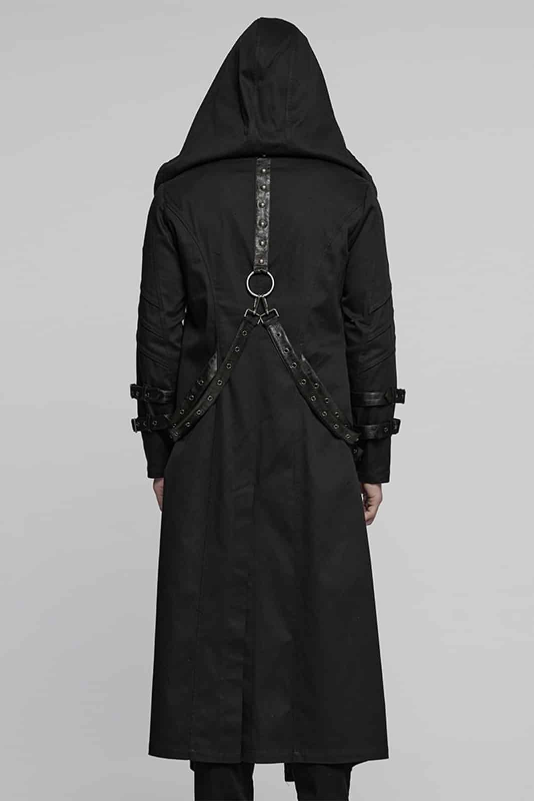 Langer, offener Herrenmantel im Cyberpunk-Stil mit markanter Kapuze und aufwendigen Riemendetails. Die strukturierte Front mit feinen Falten und die Schnallenelemente an Rücken und Ärmeln verleihen dem Design einen futuristisch-düsteren Look – ideal für moderne Gothic- oder Techwear-Outfits.