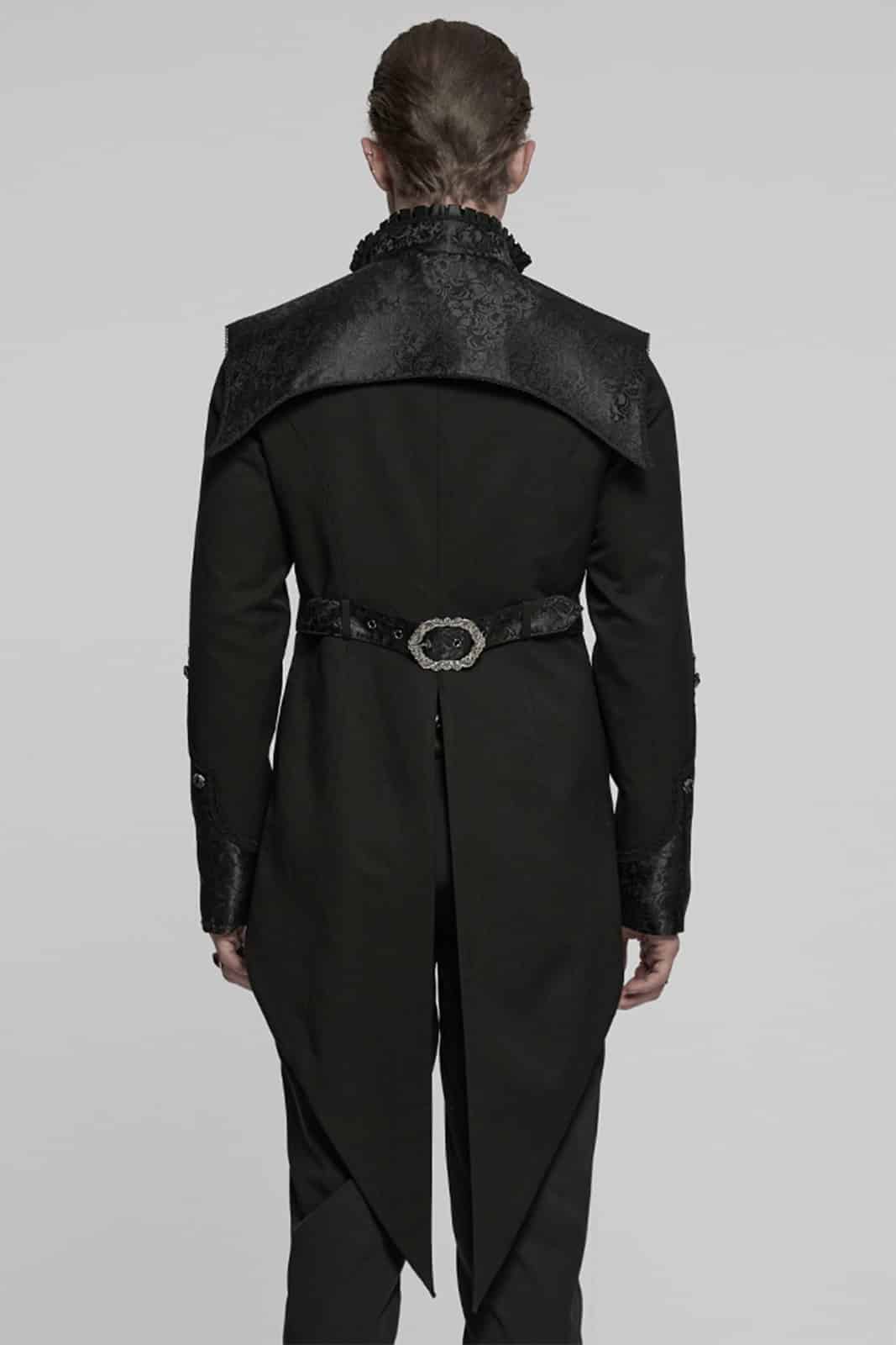 Eleganter viktorianischer Frack für Herren mit aufwendig gemusterten Jacquard-Einsätzen und feinen silbergravierten Knöpfen. Der figurbetonte Schnitt, der hohe Kragen und die dekorative Schnalle am Rücken verleihen diesem Gothic-Jacket einen edlen, aristokratischen Charakter.