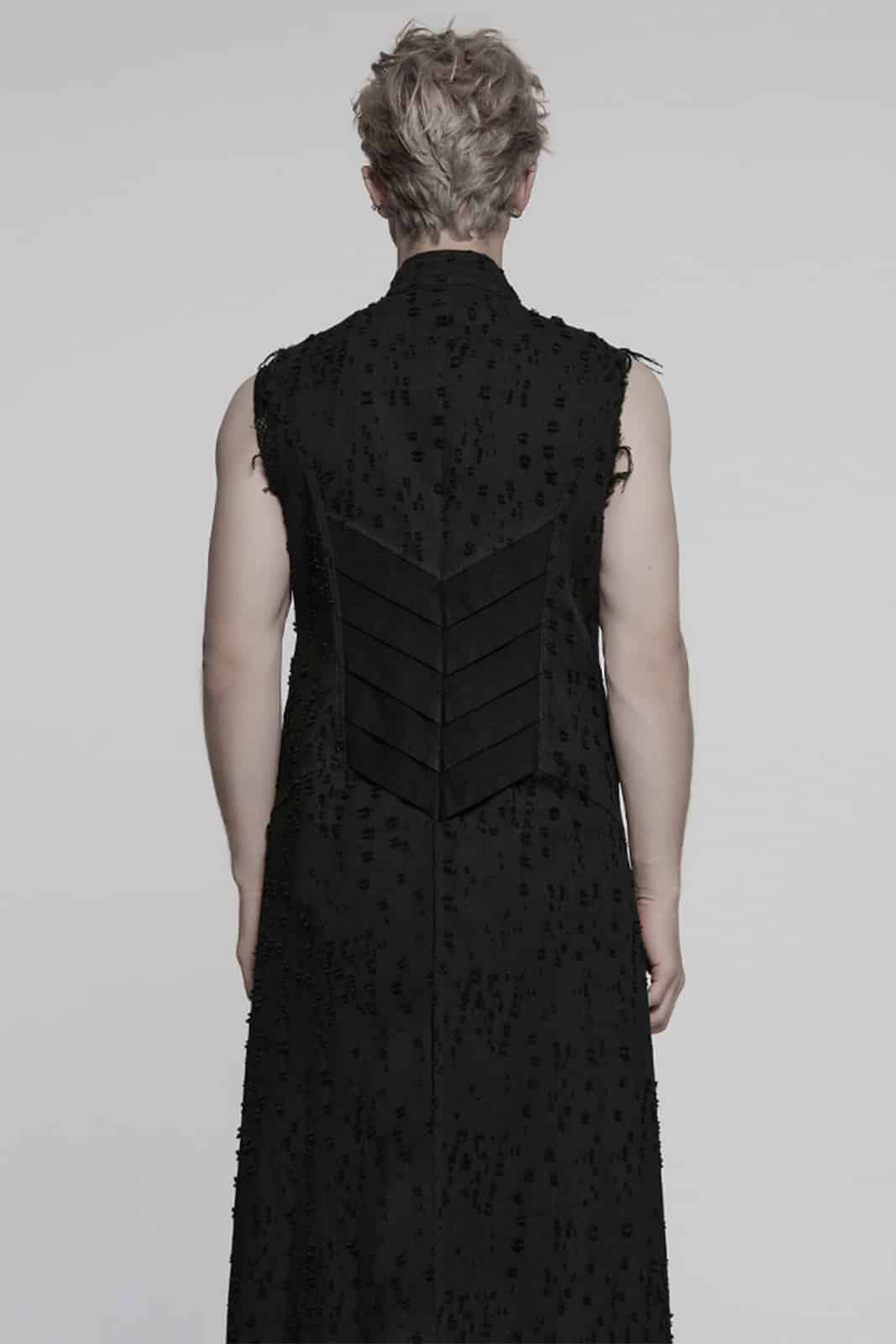 Lange, ärmellose Herrenweste im Dark-Punk-Stil mit markantem Strukturdesign und robuster Ausstrahlung. Der durchgehende Reißverschluss und die abgestuften Paneele an Vorder- und Rückseite verleihen dem Look eine kraftvolle, futuristische Note – perfekt für dystopische oder alternative Outfits.