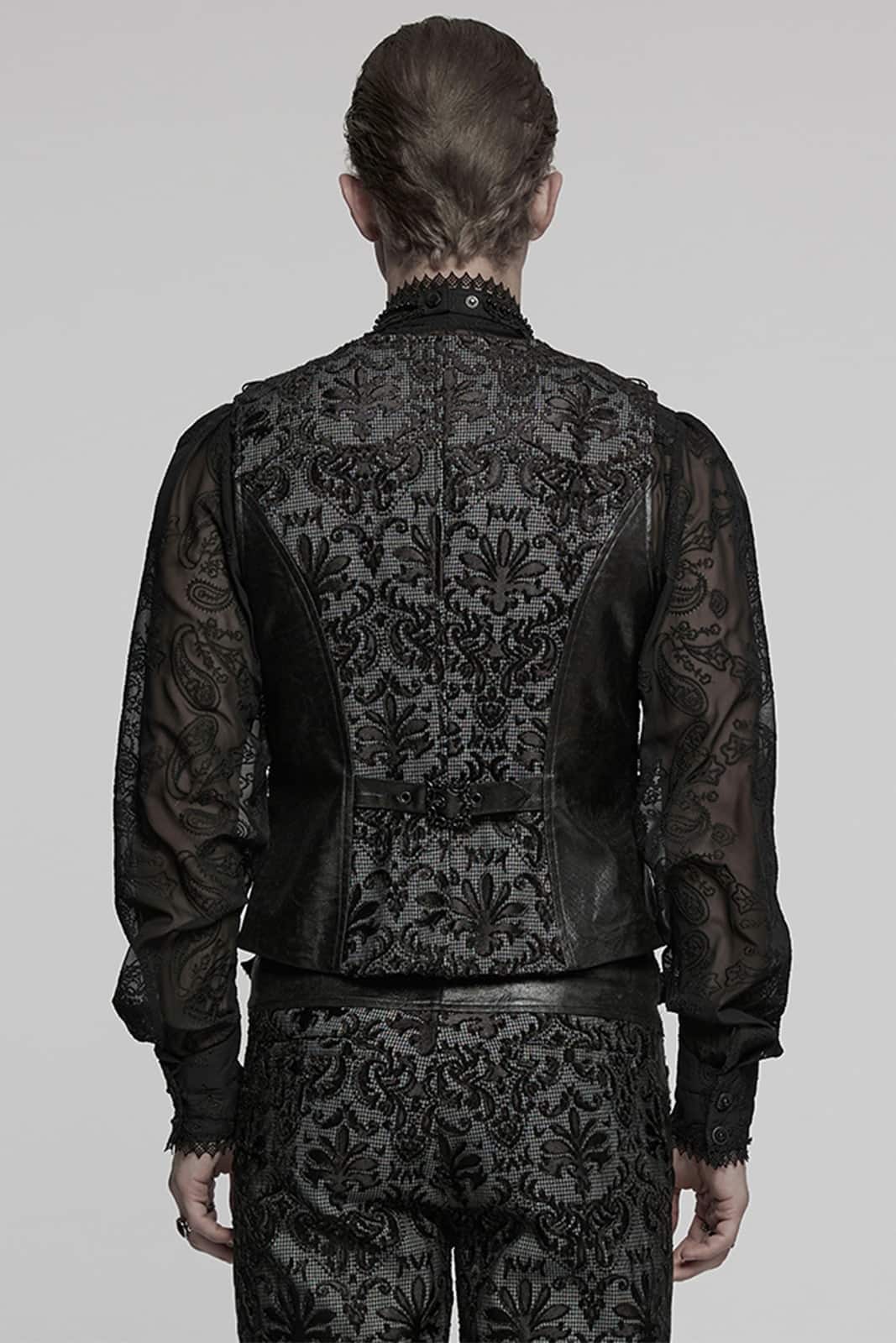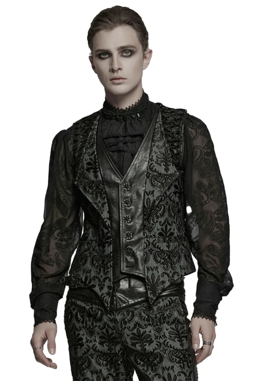 Edle, taillierte Gothic-Weste im viktorianischen Stil mit aufwendig besticktem Hahnentrittmuster in Schwarz und Grau. Kunstlederdetails an Front und Rücken, eine spitz zulaufende Saumlinie und ein verstellbarer Riemen betonen den edlen, aristokratischen Look – perfekt für festliche oder elegante Gothic-Outfits.